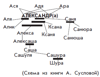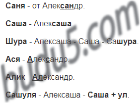 Рассмотри схему образования сокращённых имён от имени Александр(а). Расскажи, как образовались, например, имена Саня, Саша, Шура, Ася, Алик, Сашуля.