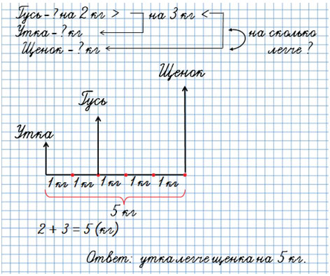5. Гусь тяжелее утки на 2 кг, но легче щенка на 3 кг. На сколько килограммов утка легче щенка?