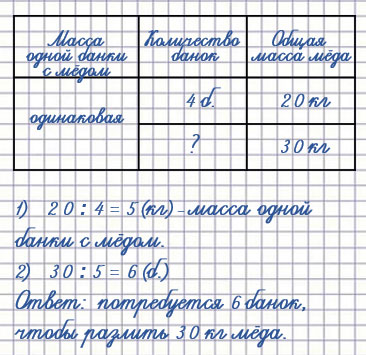 6. В 4 одинаковые банки разлили 20 кг мёда. Сколько потребуется таких банок, чтобы разлить 30 кг мёда?