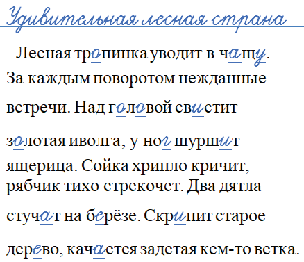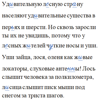 Лесная тр..пинка уводит в ч..щ... За каждым поворотом нежданные встречи. Над г..л..вой св..стит з..лотая иволга‚ у но.. шурш..т ящерица. Сойка хрипло кричит, рябчик тихо стрекочет. Два дятла стуч..т на б..рёзе. Скр..пит старое дер..во, кач..ется задетая кем-то ветка. Уд..вительную л..сную стр..ну населяют уд..вительные существа в пер..ях и шерсти. Но сквозь заросли ты их не увидишь, потому что у л..сных ж..телей ч..ткие носы и уши. Уши зайца, лося, оленя как ж..вые локаторы, слуховые анте…ы! Лось слышит человека за полкилометра, л..сица слышит писк мыши под снегом за триста шагов.