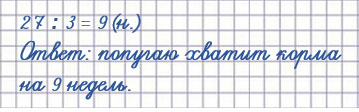 5. Петя купил упаковку корма для попугая. В упаковке 27 пакетиков. На сколько недель хватит попугаю этого корма, если каждую неделю он съедает по 3 пакетика корма?