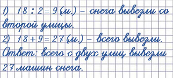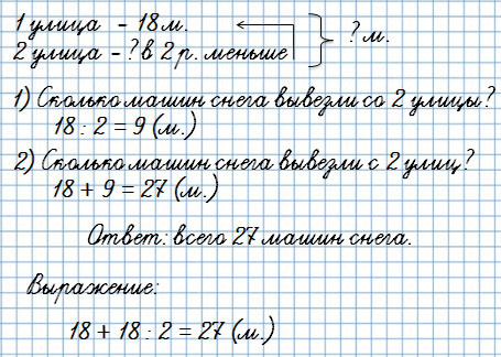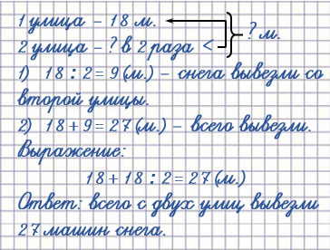 1. С одной улицы вывезли 18 грузовых машин снега, а с другой — в 2 раза меньше. Сколь­ко всего машин снега вывезли с двух улиц?