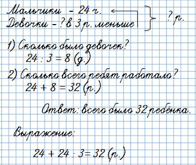 2. Ребята расчищали от снега дорожки около шко­лы. Мальчиков было 24, а девочек — в 3 раза меньше. Сколько всего ребят работало на рас­чистке дорожек от снега?