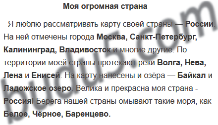 Я люблю рассматривать карту своей страны - ... .На ней отмечены города ..., ..., .... и многие другие. По территории моей страны протекают реки ..., ..., ... и ... . На карту нанесены и озёра - ... и ... . Велика и прекрасна моя страна - ... ! Берега нашей страны омывают такие моря, как ... .