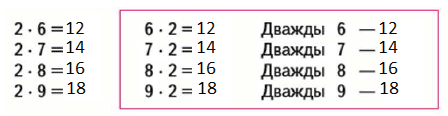 | 6 • 2 = 12 по 6 взять 2 раза | 9 • 2 = 18 по 9 взять 2 раза |