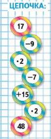 | 8 • 5 | 7 • 5 + 6 | 9 • 3 - 12 | 24 : 3 + 17 |