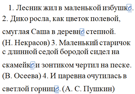 1. Лесник жил в маленькой избушк_. 2. Дико росла, как цветок полевой, смуглая Саша в деревн_ степной. (Н. Некрасов) 3. Маленький старичок с длинной седой бородой сидел на скамейк_ и зонтиком чертил на песке. (В. Осеева) 4. И царевна очутилась в светлой горниц_. (А. С. Пушкин)
