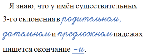 Я знаю, что у имён существительных 3-го склонения в _____, ______ и ________ падежах пишется окончание _____.