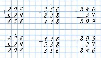| 208 + 629 | 356 - 238 | 846 - 37 |