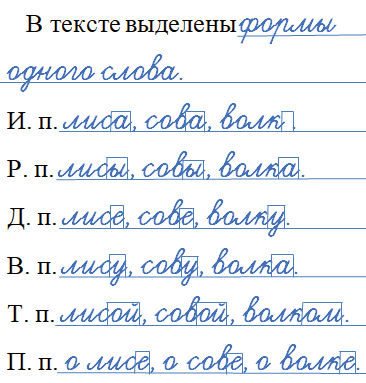 Измените по падежам и запишите слова: лиса, сова, волк. Окончания выделите.