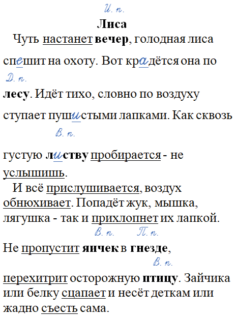 Чуть настанет вечер, голодная лиса сп_шит на охоту. Вот кр_дётся она по лесу. Идёт тихо, словно по воздуху ступает пуш_стыми лапками. Как сквозь густую л_ству пробирается - не услышишь.