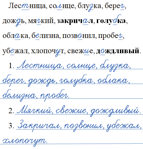 Лес_ница, со_нце, блу_ка, бере_, дож_ь, мя_кий, закрич_л, голу_ка, обл_ка, б_лизна, повз_нил, пробе_, уб_жал, хлопоч_т, свеж_е, д_ждливый.