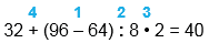 1) 96 - 64 = 32 2) 32 : 8 = 4 3) 4 • 2 = 8 4) 32 + 8 = 40 |