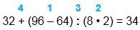 1) 96 - 64 = 32 2) 8 • 2 = 16 3) 32 : 16 = 2 4) 32 + 2 = 34 |