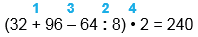 1) 64 : 8 = 8 2) 32 + 96 = 128 3) 128 - 8 = 120 4) 120 • 2 = 240 |