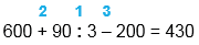 1) 90 : 3 = 30 2) 600 + 30 = 630 3) 630 - 200 = 430 |