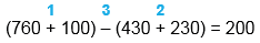 1) 760 + 100 = 860 2) 430 + 230 = 660 3) 860 - 660 = 200 |