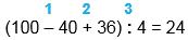 | 40 : (8 + 2) • 100 | (100 - 40 + 36) : 4 |