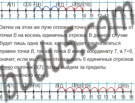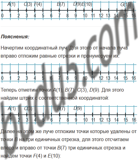 Начертите координатный луч и отметьте на нём точки А(1), В(7), С(3), D(9). На этом же луче отметьте точки, которые удалены от точки В: 1) на три единичных отрезка; 2) на восемь единичных отрезков. Найдите координаты этих точек.