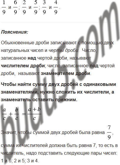Назовите все пары правильных дробей со знаменателем 9, сумма которых равна