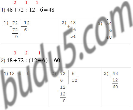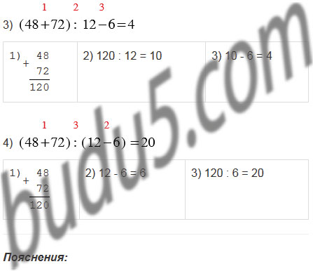 1) 48 + 72 : 12 - 6; 3) (48 + 72) : 12 - 6;