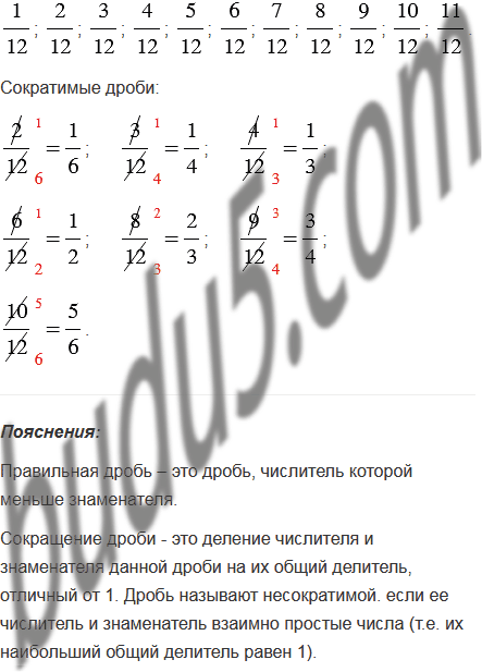 Запишите все правильные дроби со знаменателем 12. Сократите те из них, которые не являются несократимыми.