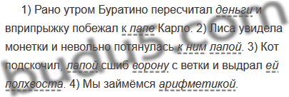 1) Рано утром Буратино пересчитал деньги и вприпрыжку побежал к папе Карло. 2) Лиса увидела монетки и невольно потянулась к ним лапой. 3) Кот подскочил, лапой сшиб ворону с ветки и выдрал ей полхвоста. 4) Мы займёмся арифметикой.
