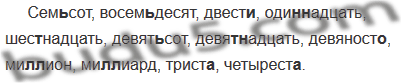 Сем(?)сот, восем(?)десят, двест.., оди(н, нн)адцать, шес(?)надцать, девят(?)сот, девят(?)надцать, девяност.., ми(л, лл)ион, ми(л, лл)иард, трист.., четырест.. .