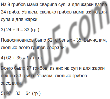 Задание № 10. Дима с Сашей собрали в лесу подосиновики и белые грибы. Подосиновиков было 62, а белых - на 27 меньше. Из 9 грибов мама сварила суп, для жарки она взяла на 15 грибов больше, чем для супа, а остальные засолила. Сколько грибов засолили?