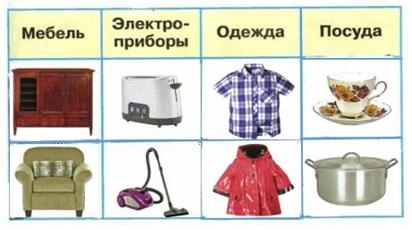 1. Группы предметов, которые окружают нас дома – это мебель, одежда, посуда, электроприборы.