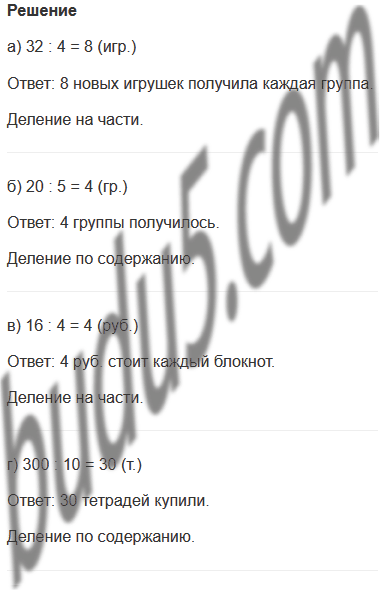 а) В детский сад привезли 32 игрушки и раздали поровну в 4 группы. Сколько новых игрушек получила каждая группа?