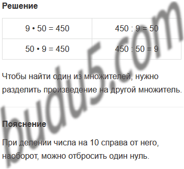 Задание № 2. Составь 4 равенства из чисел 9, 50, 450. Как можно выполнить деление 450 : 9, 450 : 50, используя связь умножения и деления?