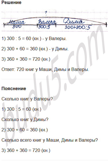 Задание № 3. У Маши в библиотеке 300 книг, у Валеры - в 5 раз меньше, чем у Маши, а у Димы - столько, сколько у Маши и Валеры вместе. Сколько всего книг у Маши, Димы и Валеры?