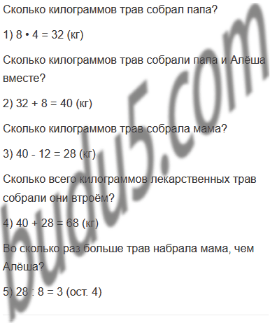 Задание № 58. Алёша собрал 8 кг лекарственных трав, его папа - в 4 раза больше Алёши, а мама - на 12 кг меньше, чем Алёша и папа вместе. Сколько всего килограммов лекарственных трав собрали они втроём? Во сколько раз больше трав набрала мама, чем Алёша?