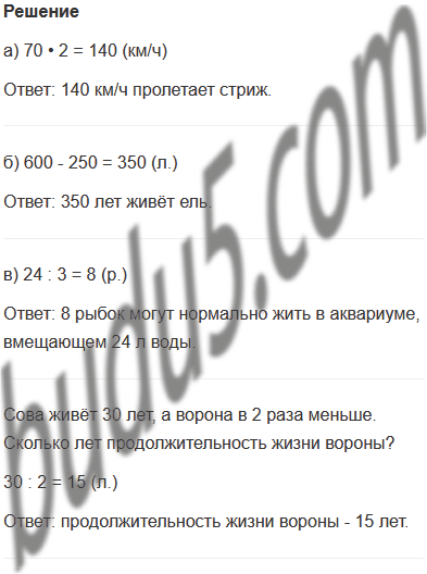 б) Сосна живёт примерно 600 лет. Это на 250 лет больше, чем живёт ель. Сколько лет живёт ель?