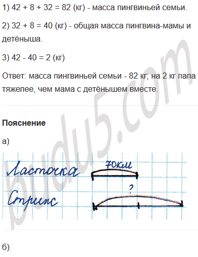 г) Масса пингвина-папы 42 кг, пингвина-мамы - 32 кг, а их детёныша - 8 кг. Чему равна масса этой пингвиньей семьи? На сколько папа тяжелее, чем мама с детёнышем вместе?