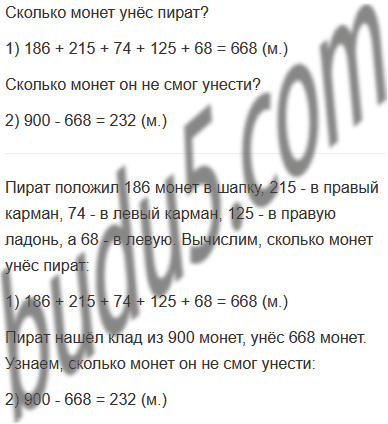 Задание № 12. Пират нашёл клад из 900 монет. Чтобы побыстрее его унести, он положил 186 монет в шапку, 215 - в правый карман, 74 - в левый карман, 125 - в правую ладонь, а 68 - в левую. Сколько монет он не смог унести?