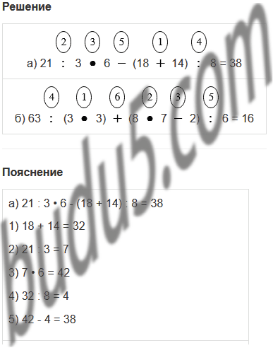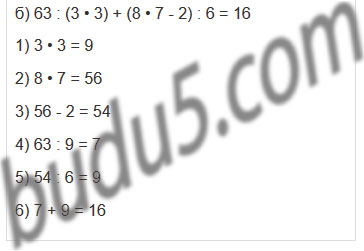 а) 21 : 3 • 6 - (18 + 14) : 8 б) 63 : (3 • 3) + (8 • 7 - 2) : 6