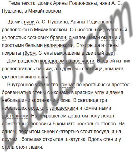Рассмотрите фотографии домика Арины Родионовны, няни А. Пушкина. Прочитайте текст и определите его тему. Опишите фотографии, используя информацию текста, подчеркните в получившемся тексте дополнения.