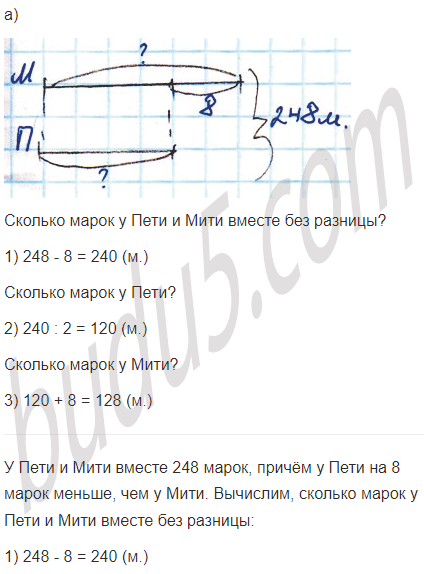а) У Пути и Мити вместе 248 марок, причём у Пети на 8 марок меньше, чем у Мити. Сколько марок у каждого из ребят?