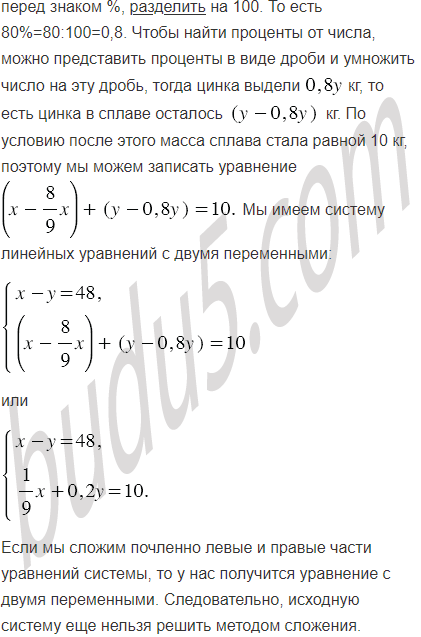 В куске сплава меди и цинка последнего было на 48 кг меньше, чем меди. После того как из сплава выделили содержавшейся в нём меди и 80% цинка, масса сплава стала равной 10 кг. Сколько килограммов каждого вещества было в сплаве первоначально?