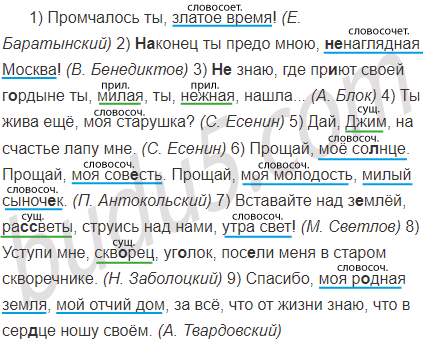 1) Промчалось ты златое время! (Е. Баратынский) 2) (На)конец ты предо мною (не)наглядная Москва! (В. Бенедиктов) 3) (Не)знаю где пр..ют своей г..рдыне ты милая ты нежная нашла... (А. Блок) 4) Ты жива ещё моя старушка? (С. Есенин) 5) Дай Джим на счастье лапу мне. (С. Есенин) 6) Прощай моё со(?)нце. Прощай моя сов..сть. Прощай моя молодость милый сыноч..к. (П. Антокольский) 7) Вставайте над з..млёй ра(с, сс)веты струись над нами утра свет! (М. Светлов) 8) Уступи мне скв..рец уг..лок пос..ли меня в старом скворечнике. (Н. Заболоцкий) 9) Спасибо моя р..дная земля мой отчий дом за всё что от жизни знаю что в сер(?)це ношу своём. (А. Твардовский)