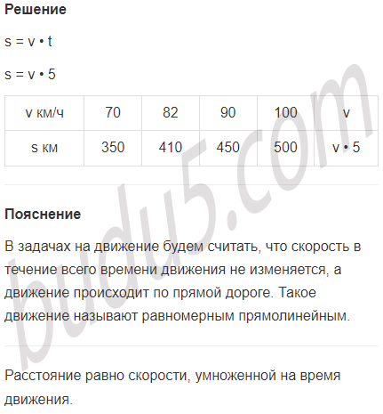 Задание № 3. Какое расстояние пройдёт поезд за 5 ч, если движения со скоростью 70 км/ч, 82 км/ч, 90 км/ч, 100 км/с, v км/ч? Составь формулу зависимости расстояния s от скорости v.