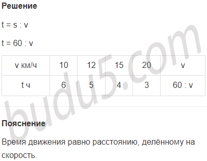 Задание № 4. Сколько времени потребуется велосипедисту, чтобы проехать 60 км, если скорость его движения 10 км/ч, 12 км/ч, 15 к/ч, 20 км/ч, v км/ч? Составь формулу зависимости времени t от скорости v.