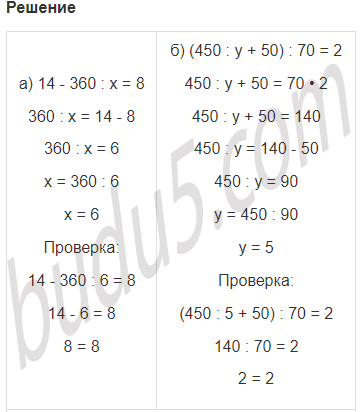 а) 14 - 360 : х = 8 б) (450 : у + 50) : 70 = 2