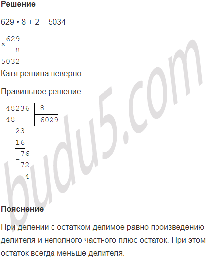 Задание № 9. Кате надо было разделить число 48236 на 8. У неё получилось частное 629 и остаток 2. Проверь её вычисления с помощью формулы деления с остатком. Найди ошибку и выполни деление правильно.