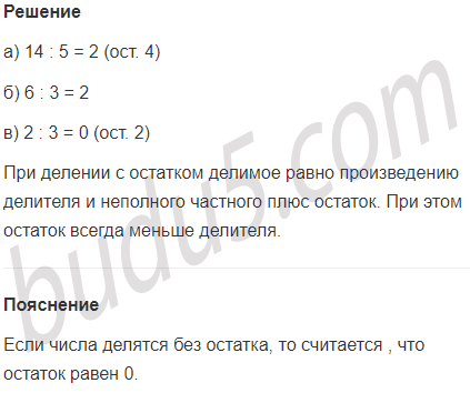 Задание № 10. Найди частное и остаток при делении: а) числа 14 на число 5; б) числа 6 на число 3; в) числа 2 на число 3. Обоснуй свой ответ, пользуясь формулой деления с остатком.