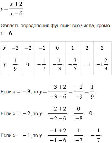 Все значения, которые принимает независимая переменная (аргумент), образуют область определения функции. Значит, область определения функции составляют все числа, кроме = 6, так как при = 6  знаменатель рассматриваемой функции обращается в ноль, а на ноль делить нельзя.