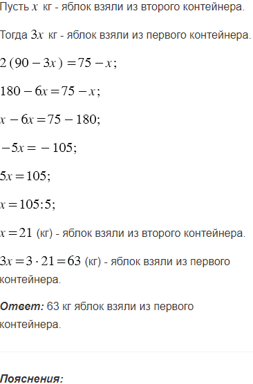 В одном контейнере было 90 кг яблок, а в другом - 75 кг. После того как из первого контейнера взяли в три раза больше яблок, чем из второго в первом осталось в 2 раза меньше яблок, чем во втором. Сколько килограммов яблок взяли из первого контейнера?