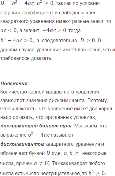 Докажите, что если старший коэффициент и свободный член квадратного уравнения имеют разные знаки, то уравнение имеет два корня.